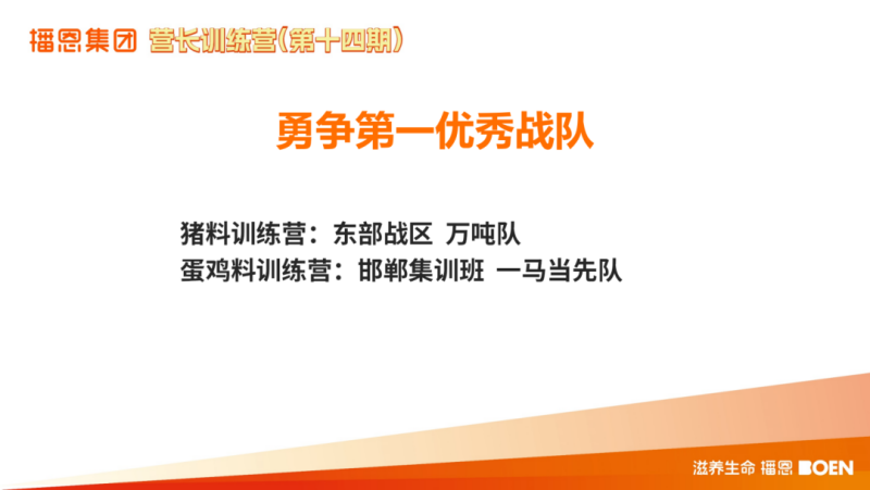 曹剑波副总裁对训练营的组织与实施给予了高度评价。他认为,本次训练营聚焦价值营销,并融入了很多新的亮点,不仅提升了营长们的专业素养,更为播恩集团打造了一支更加高效、专业的营销团队,为企业的长远发展奠定了坚实基础。并以播恩核心价值观“理想、行动、担当”勉励学员: 以清晰的目标和坚决的行动勇争第一!