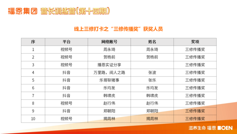在闭营仪式上,播恩集团还对表现突出的营长们进行了表彰,颁发了荣誉证书和奖品,以彰显他们在训练营期间的卓越表现。这些营长们不仅在课程学习中展现出卓越的能力,更在三修实践活动中充分展现了协作精神和创新能力。