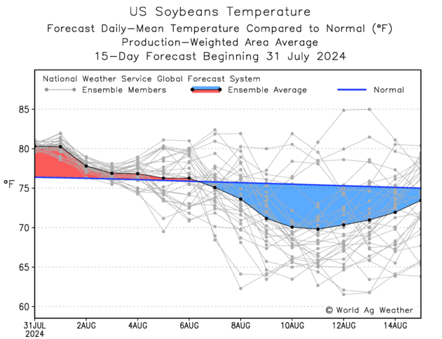 未来15天美国大豆产区温度预测图(2024.8.1)