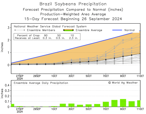 未来15天巴西大豆产区降雨预测图(2024.9.27)