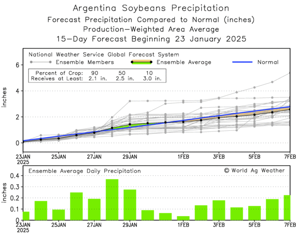 未来15天阿根廷大豆产区降雨和温度预测图(2025.1.24)