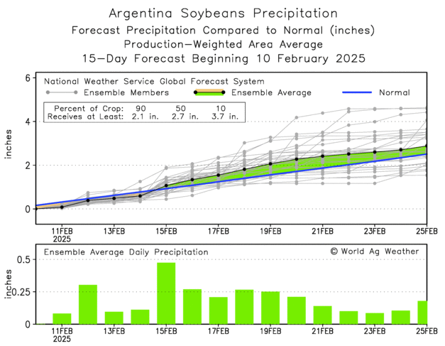 未来15天阿根廷大豆产区降雨和温度预测图(2025.2.11)