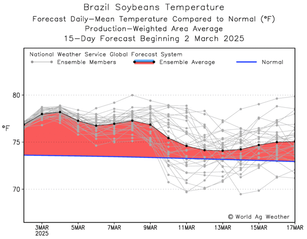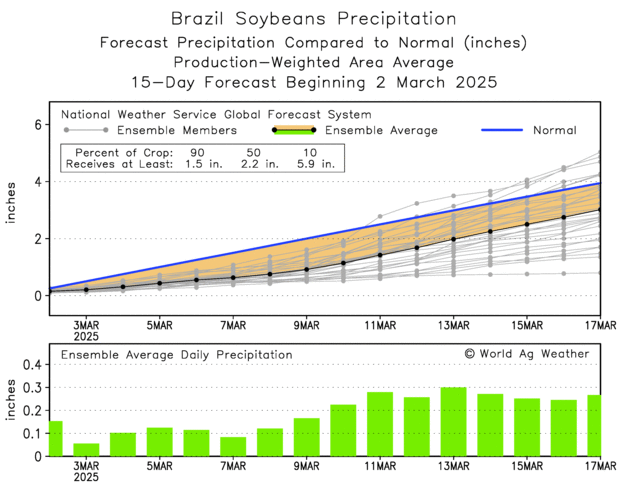 未来15天巴西大豆产区降雨和温度预测图(2025.3.3)
