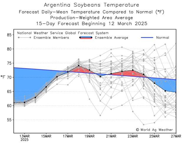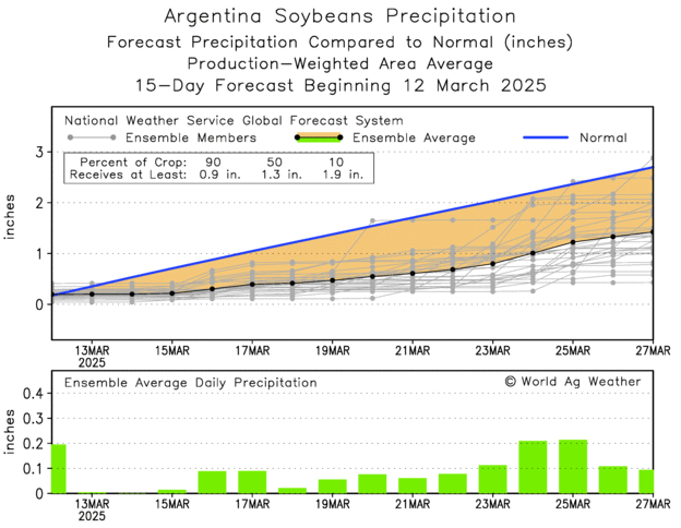 未来15天阿根廷大豆产区降雨和温度预测图(2025.3.13)