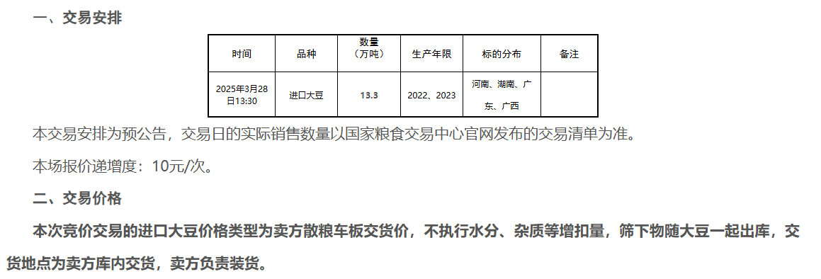 受中储粮油脂有限公司委托,2025年3月28日13:30在国家粮食和物资储备局粮食交易协调中心及联网的各省(区、市)国家粮食交易中心组织开展进口大豆竞价交易,请交易会员通过国家粮食交易中心官网(www.grainmarket.com.cn)“用户中心”,登录国家粮食交易平台,在专场列表中选择“进口大豆竞价销售交易”参与交易。现就有关事项公告如下(重点提示内容详见加粗字体部分):