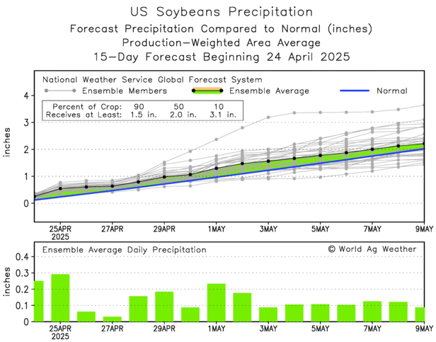 未来15天美国大豆产区降雨和温度预测图(2025.4.25)